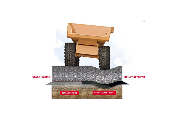 在道路工程应用中,土工格栅作为力学稳定层的一个组成部分 ,径向刚度是坦萨TriAx三向土工格栅与加固功能相关的性能。在道路中,相比方形或矩形网孔的土工格栅,TriAx三向土工格栅六边形形状提供了一个更均匀的交通荷载响应。