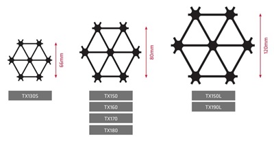 有三种不同尺寸大小的土工格栅,适用于一系列填料颗粒粒径大小,以确保颗粒粒料被很好地约束。对于TriAx 三向土工格栅,填料粒径越小就需要更小的孔径,填料粒径越大就需要更大的孔径。TriAx 三向土工格栅三种尺寸:
