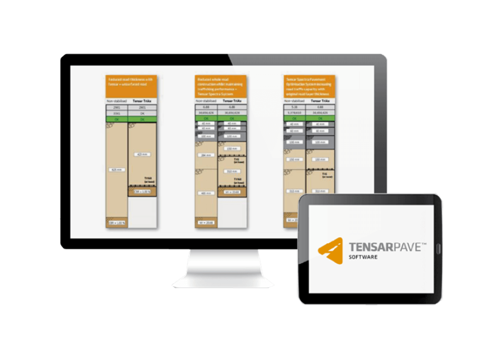 TensarPave 设计程序可让设计工程师快速生成采用坦萨土工格栅加固无粘结层的路面设计,从而通过减薄路面结构厚度获得最大的成本效益。